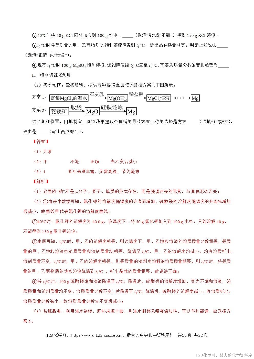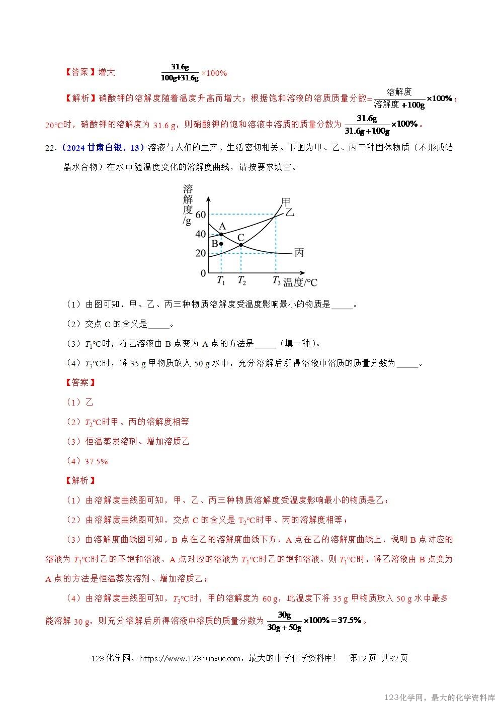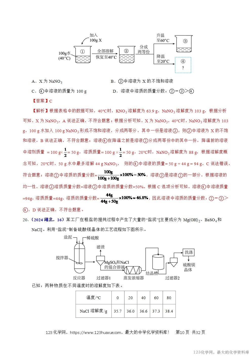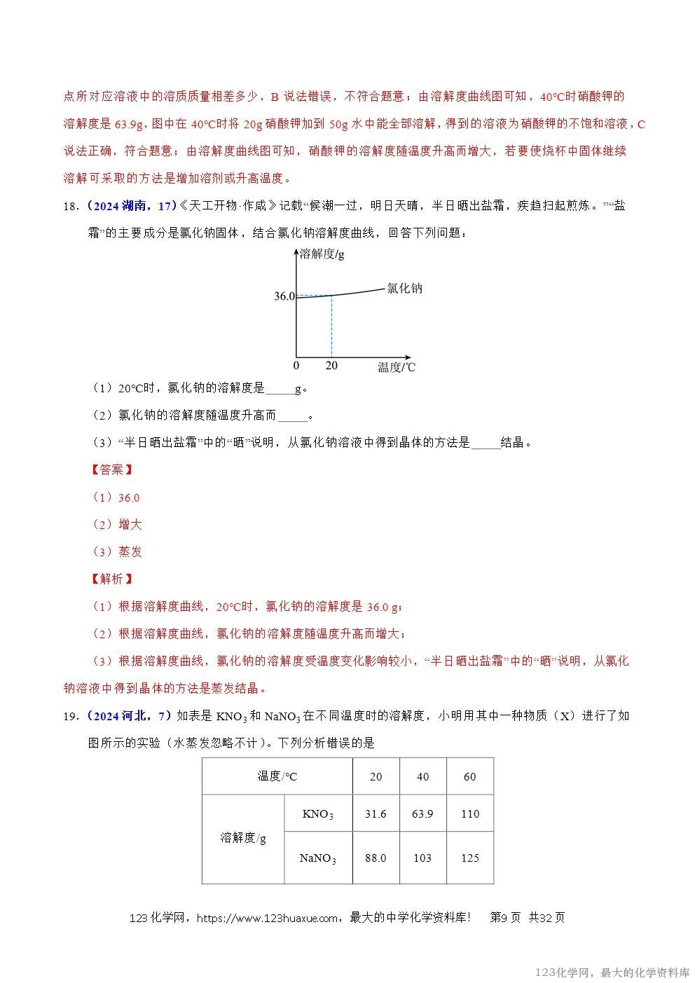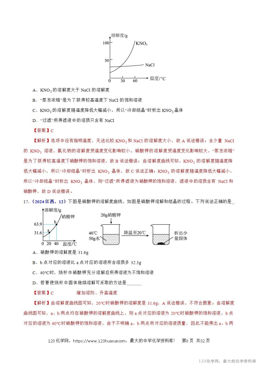 【解析】温度升高时,多数物质的饱和溶液变成不饱和溶液,但对于熟石灰而言,溶解度随温度升高而减小,故应该仍然是饱和溶液,A不正确;溶液是由一种或几种物质分散到另一种物质里形成的均一、稳定的混合物。均一稳定的液体不仅可以是溶液,还可能是纯净物,如酒精、水等,B不正确;硝酸铵在溶于水时,离子在向水中扩散时从溶液中吸收的热量要大于生成水合离子时对溶液放出的热量,从而使溶液的温度降低,C正确;溶质可以是固体,如氯化钠溶于水中,溶质是固体氯化钠;溶质可以是液体,如酒精的水溶液,溶质是液体酒精;溶质可以是气体,如汽水,溶质是气体二氧化碳。即固体、液体和气体都可以作为溶质,D不正确。