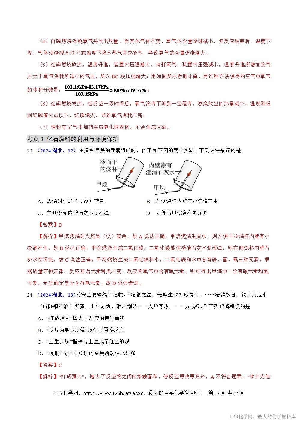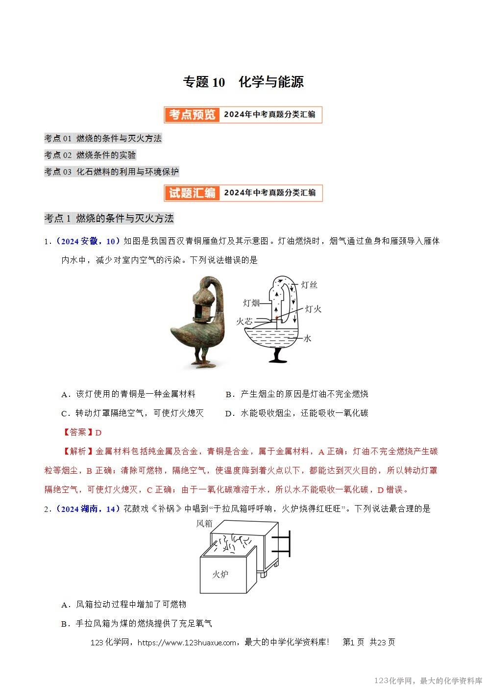 1.(2024安徽,10)如图是我国西汉青铜雁鱼灯及其示意图。灯油燃烧时,烟气通过鱼身和雁颈导入雁体内水中,减少对室内空气的污染。下列说法错误的是