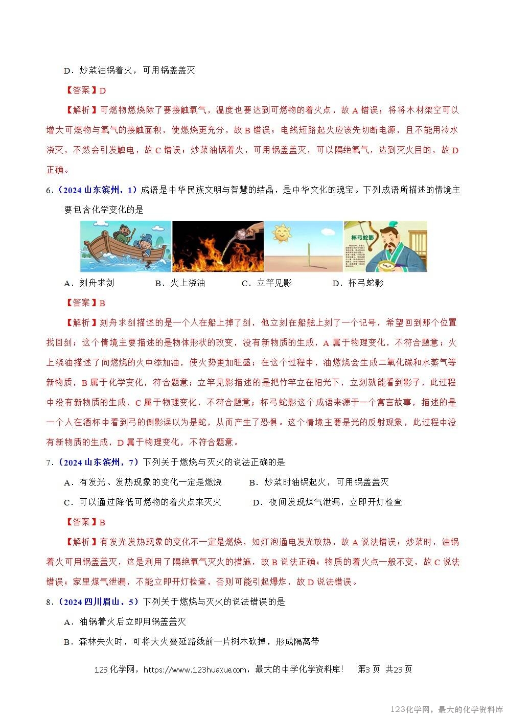 【解析】刻舟求剑描述的是一个人在船上掉了剑,他立刻在船舷上刻了一个记号,希望回到那个位置找回剑;这个情境主要描述的是物体形状的改变,没有新物质的生成,A属于物理变化,不符合题意;火上浇油描述了向燃烧的火中添加油,使火势更加旺盛;在这个过程中,油燃烧会生成二氧化碳和水蒸