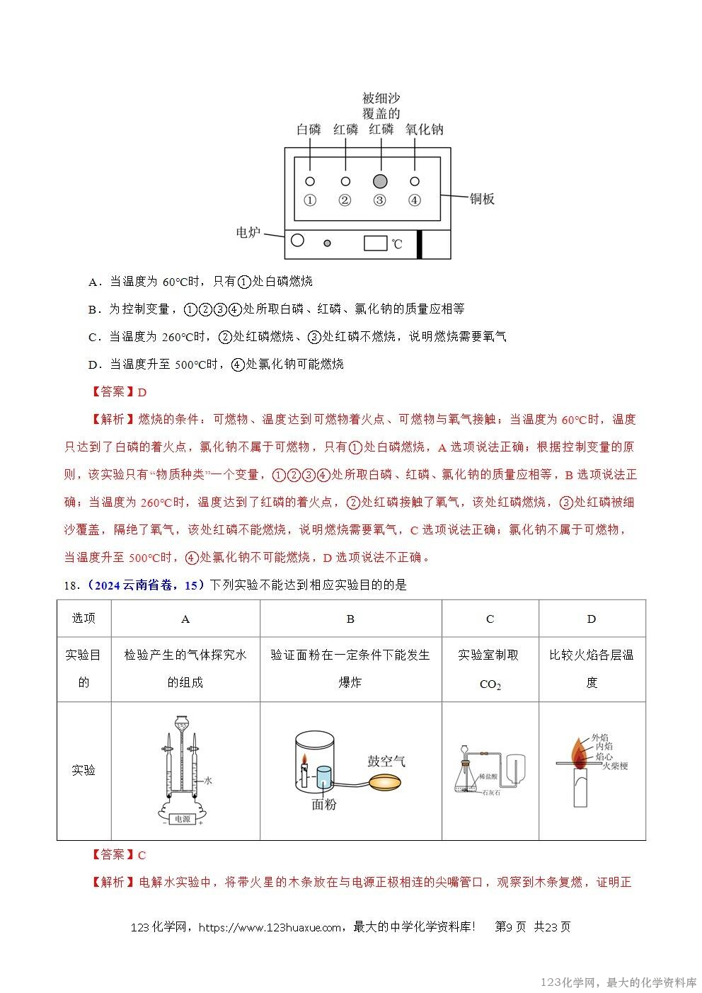 【解析】可燃物燃烧除了要接触氧气,温度也要达到可燃物的着火点,故A错误;将将木材架空可以增大可燃物与氧气的接触面积,使燃烧更充分,故B错误;电线短路起火应该先切断电源,且不能用冷水浇灭,不然会引发触电,故C错误;炒菜油锅着火,可用锅盖盖灭,可以隔绝氧气,达到灭火目的,故D正确。