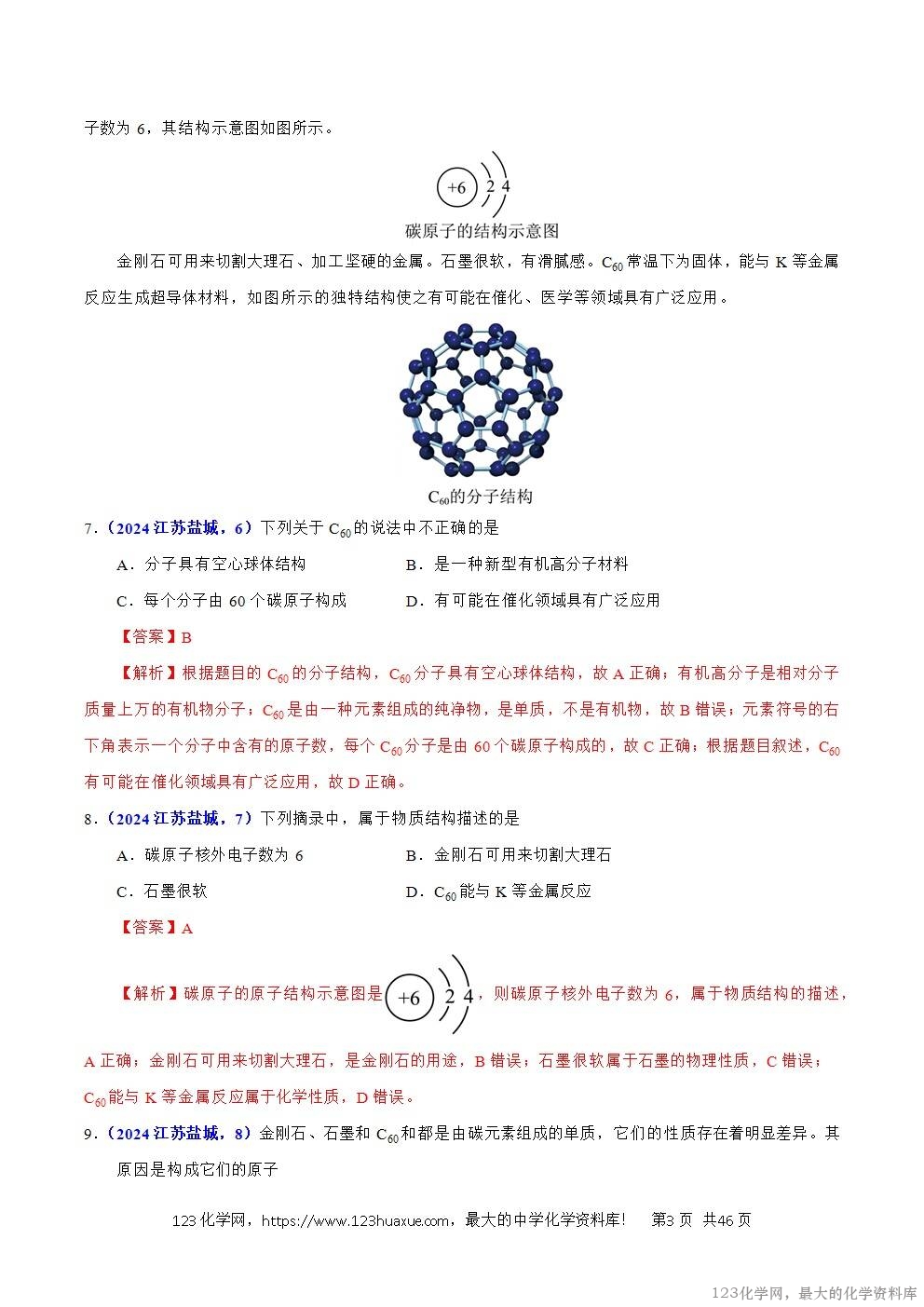透明的金刚石、灰黑色的石墨和足球状、空心球体结构的C60都是由碳元素组成的单质;碳原子核