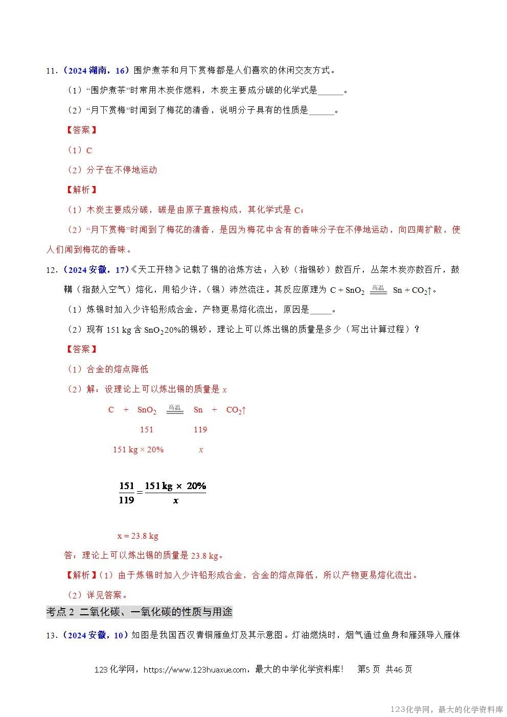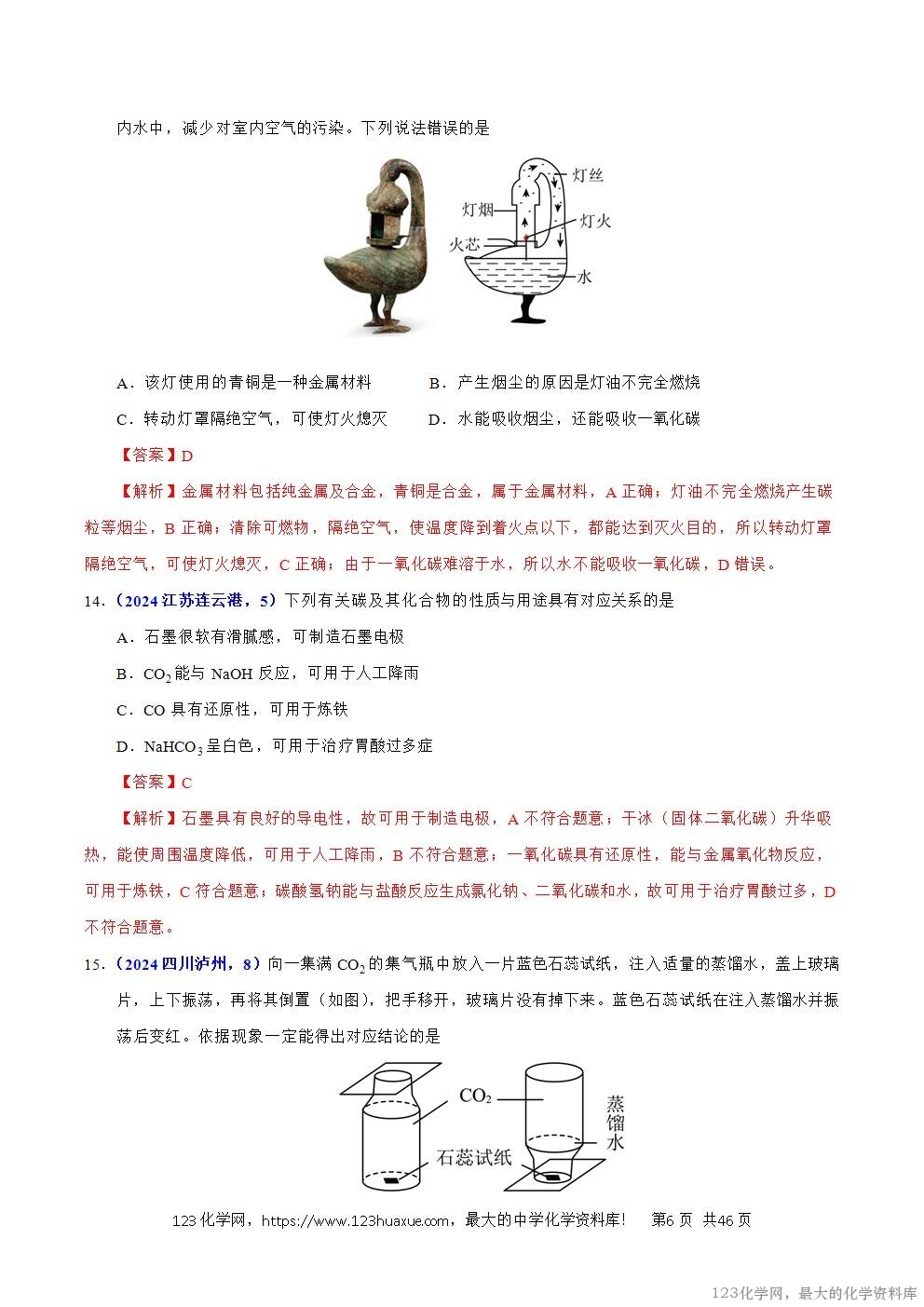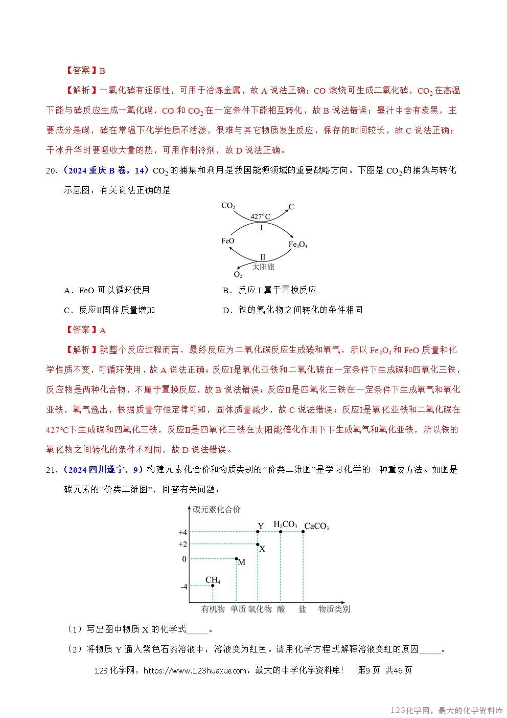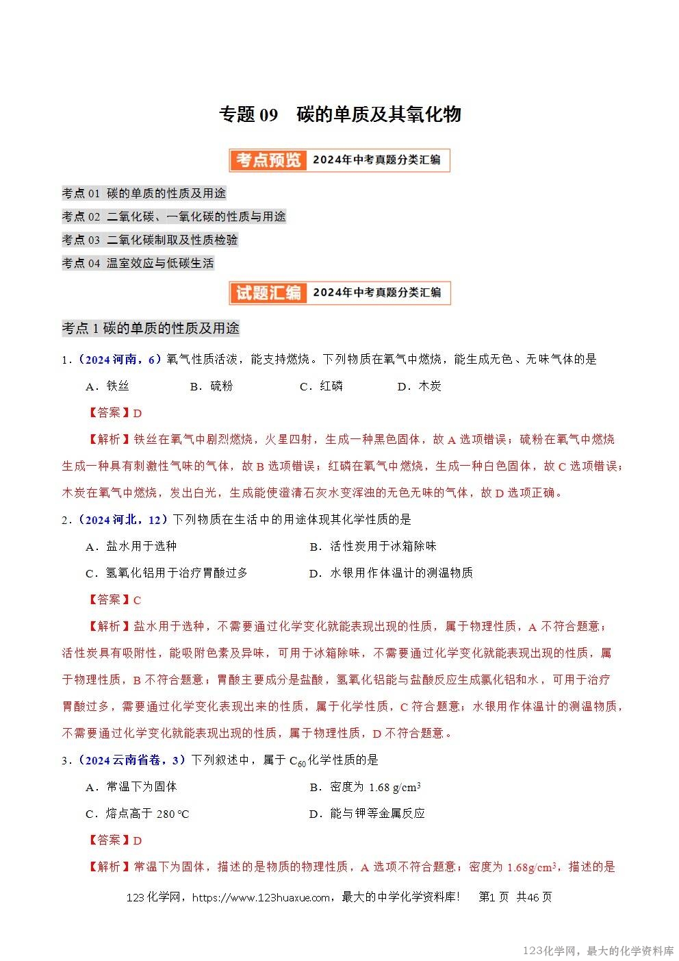 2024年中考化学试卷分类汇编专题09碳的单质及其氧化物解析版word版