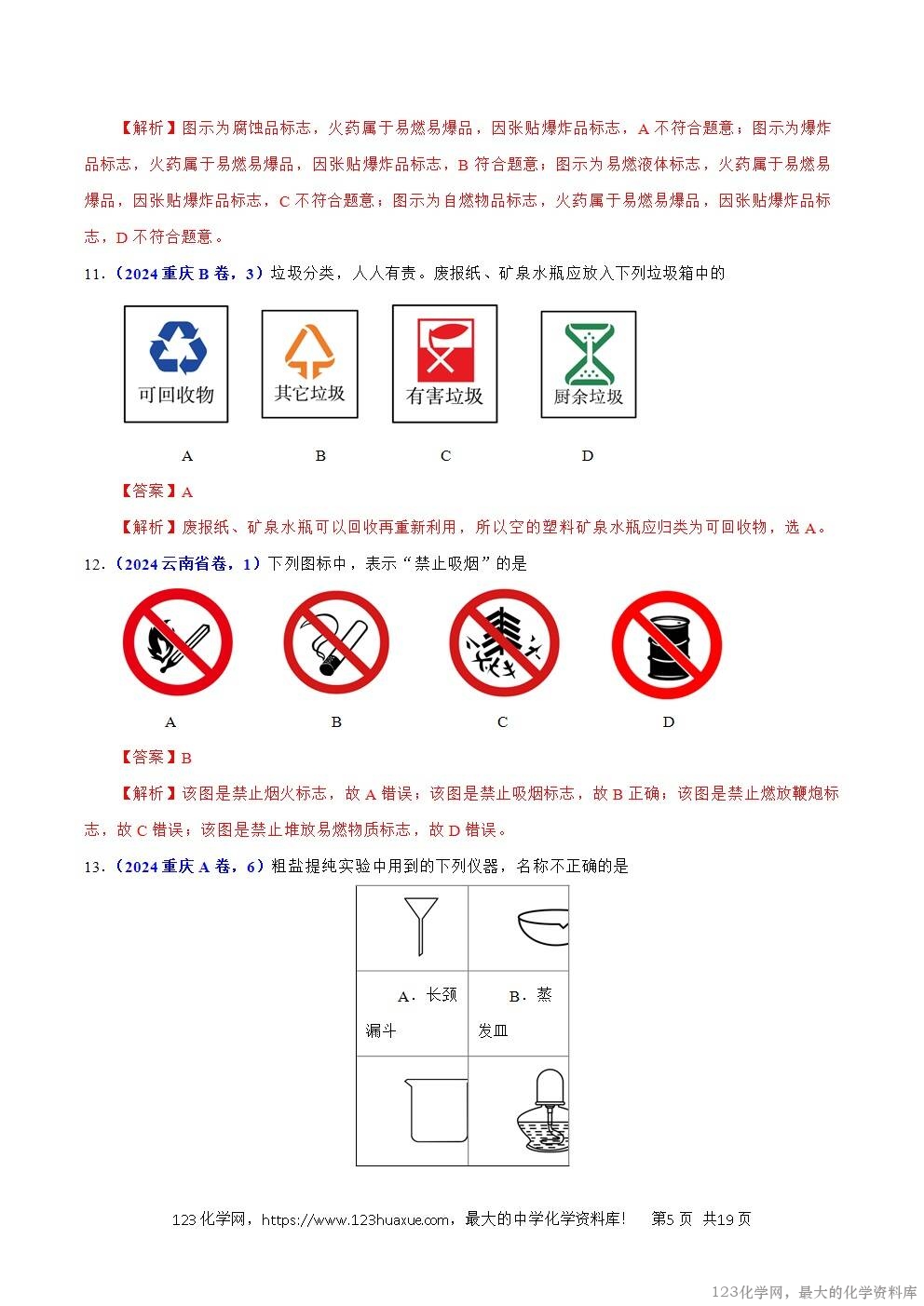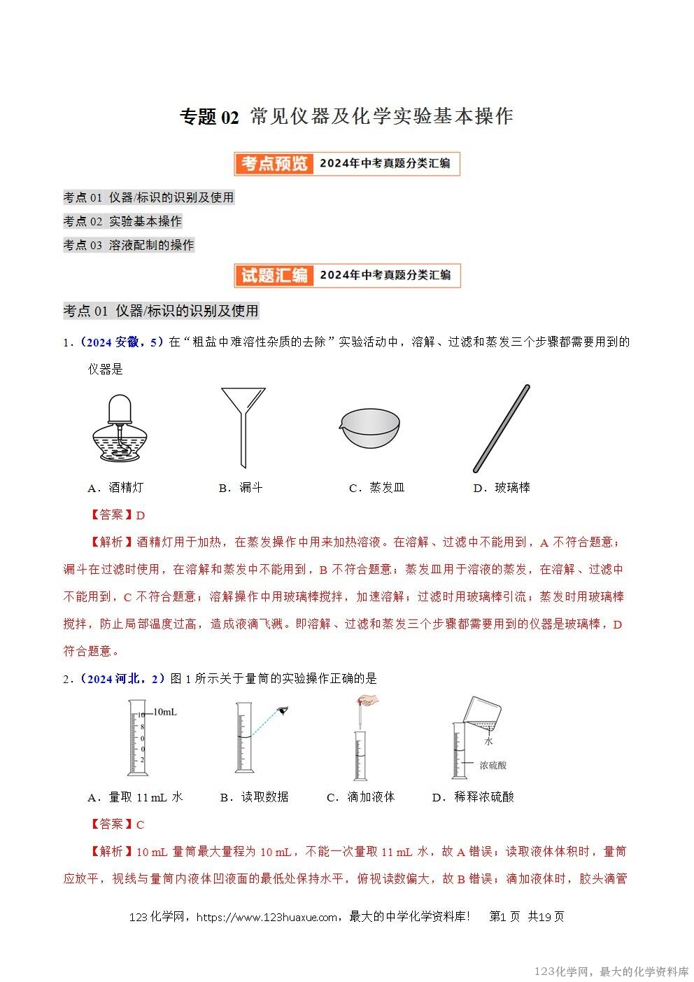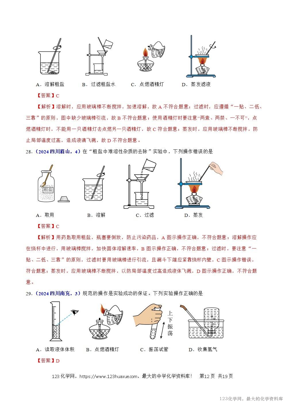1.(2024安徽,5)在“粗盐中难溶性杂质的去除”实验活动中,溶解、过滤和蒸发三个步骤都需要用到的仪器是