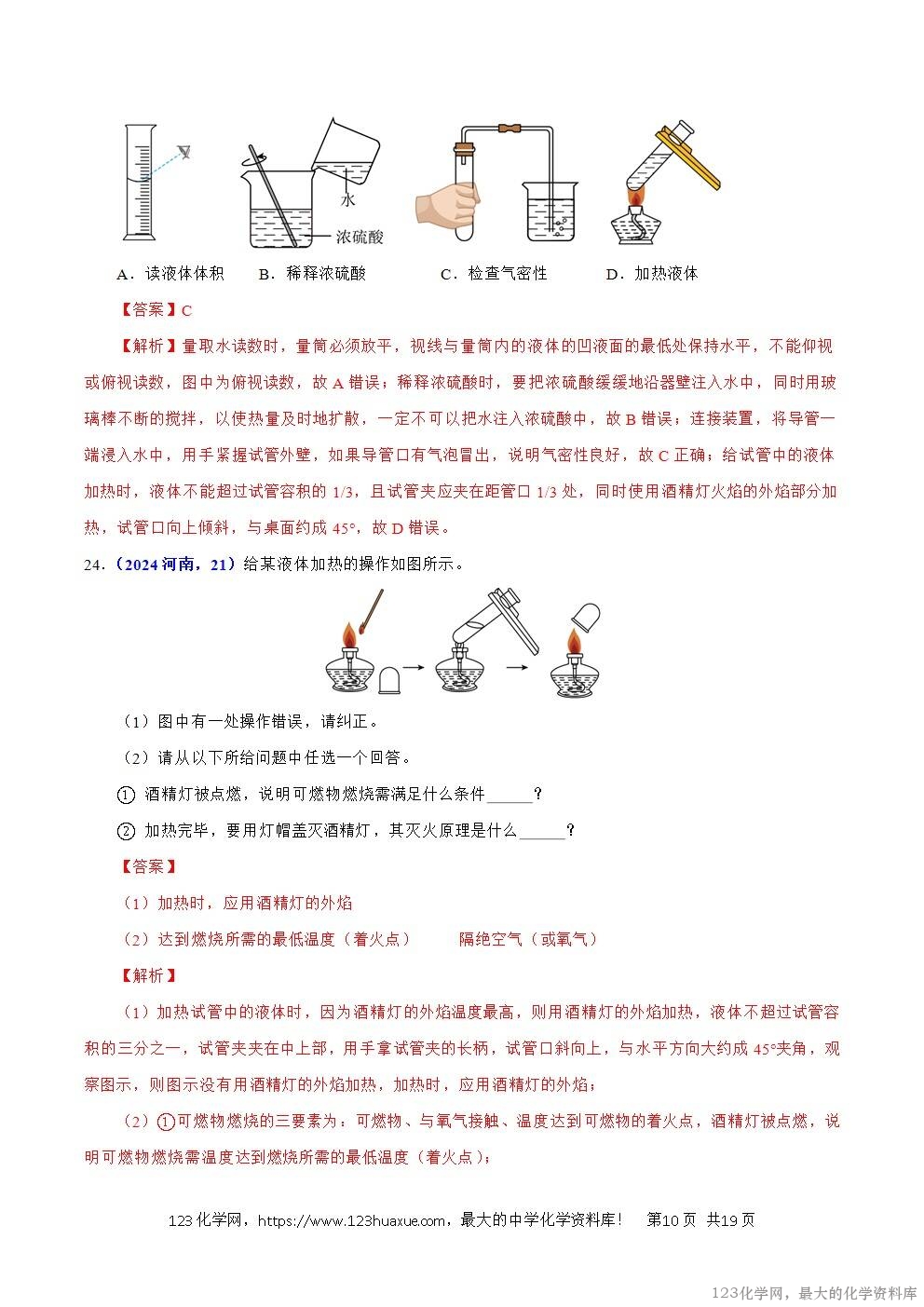 【解析】10 mL量筒最大量程为10 mL,不能一次量取11 mL水,故A错误;读取液体体积时,量筒应放平,视线与量筒内液体凹液面的最低处保持水平,俯视读数偏大,故B错误;滴加液体时,胶头滴管应垂直悬空在容器口正上方,防止污染胶头滴管,故C正确;稀释浓硫酸,一定要把浓硫酸沿容器壁慢慢注入水中,并用玻璃棒不断搅拌,使产生的热量迅速扩散,不能将水倒入浓硫酸中,否则会引起液滴飞溅,造成危险,而且不能在量筒中稀释,应在烧杯中进行,故D错误。