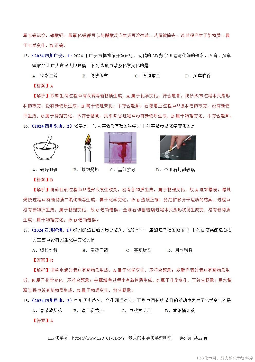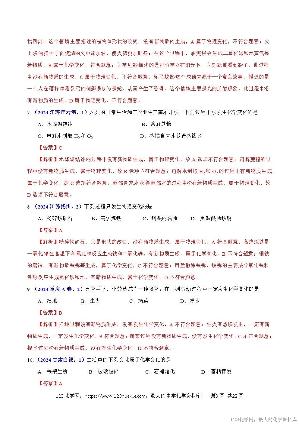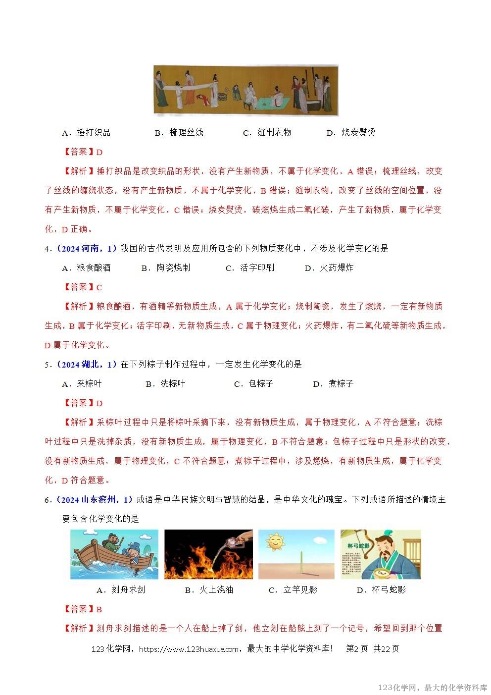 6.(2024山东滨州,1)成语是中华民族文明与智慧的结晶,是中华文化的瑰宝。下列成语所描述的情境主要包含化学变化的是