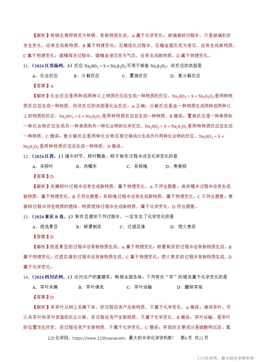 【解析】采粽叶过程中只是将粽叶采摘下来,没有新物质生成,属于物理变化,A不符合题意;洗粽叶过程中只是洗掉杂质,没有新物质生成,属于物理变化,B不符合题意;包粽子过程中只是形状的改变,没有新物质生成,属于物理变化,C不符合题意;煮粽子过程中,涉及燃烧,有新物质生成,属于化学变化,D符合题意。