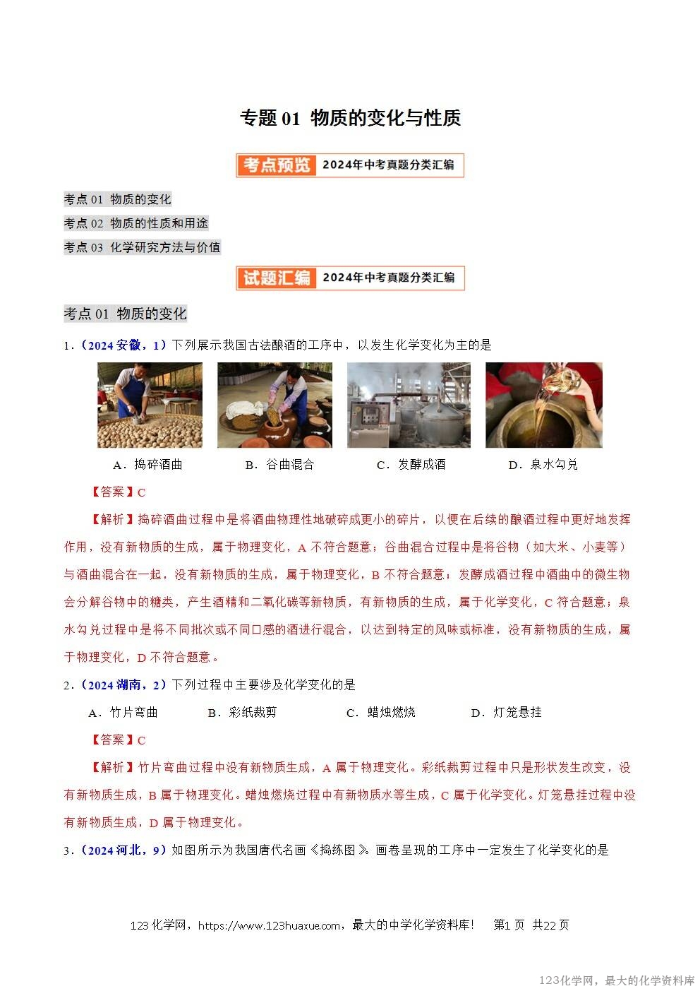 1.(2024安徽,1)下列展示我国古法酿酒的工序中,以发生化学变化为主的是