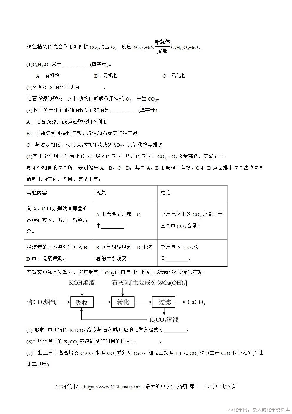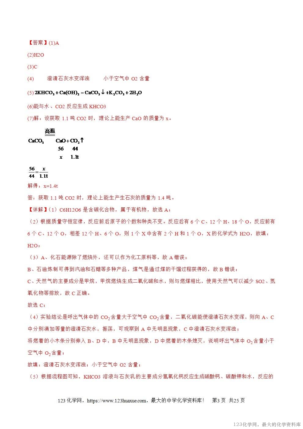 (7)工业上常用高温煅烧CaCO3制取CO2并获取CaO。理论上获取1.1吨CO2时能生产CaO多少吨?(写出计算过程)