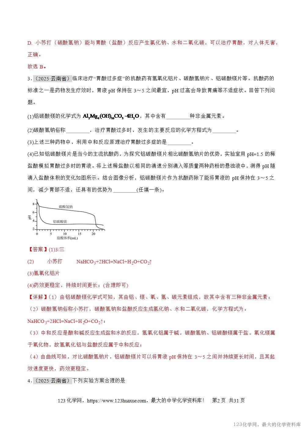 3.(2025·云南省)临床治疗“胃酸过多症”的抗酸药有氢氧化铝片、碳酸氢钠片、铝碳酸镁片等。抗酸药的标准之一是药物发生疗效时,胃液pH保持在3~5之间最宜,pH过高会导致胃痛等不适症状。回答下列问题。