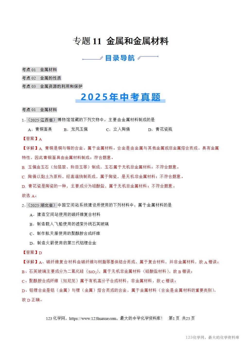 1.(2025·吉林省)1956年,在吉林省诞生了新中国第一辆解放牌汽车。生产汽车的材料中,属于金属材料的是