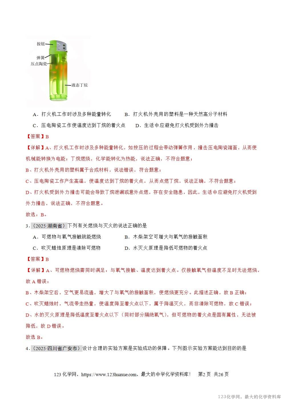 D、打火机受到外力撞击可能会导致丁烷泄漏或意外点燃,存在安全隐患,因此,生活中应避免打火机受到外力撞击,说法正确,不符合题意。