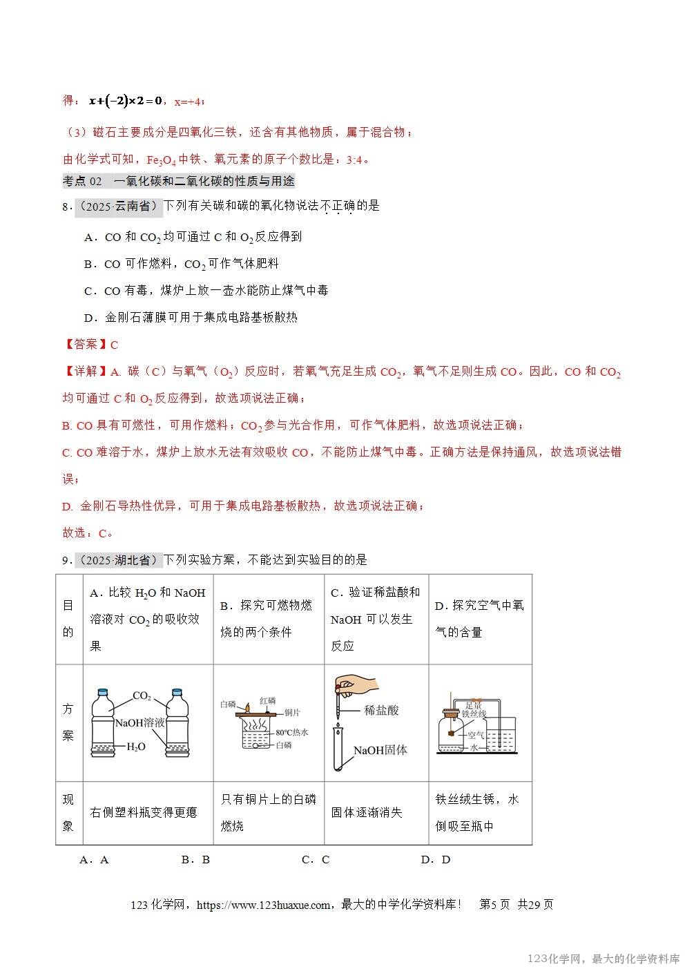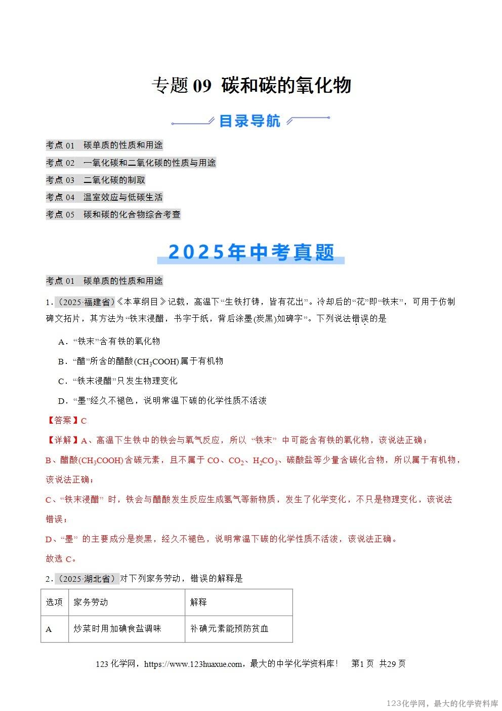 1.(2025·福建省)《本草纲目》记载,高温下“生铁打铸,皆有花出”。冷却后的“花”即“铁末”,可用于仿制碑文拓片,其方法为“铁末浸醋,书字于纸,背后涂墨(炭黑)如碑字”。下列说法错误的是