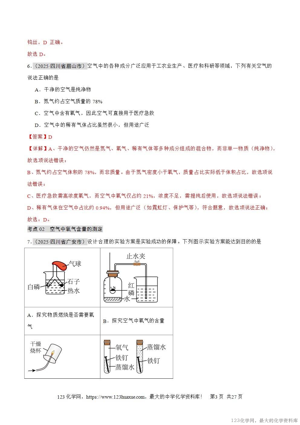 6.(2025·四川省眉山市)空气中的各种成分广泛应用于工农业生产、医疗和科研等领域,下列有关空气的说法正确的是