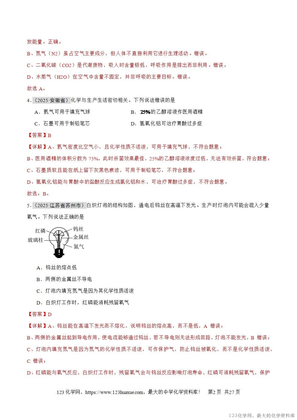 5.(2025·江苏省苏州市)白炽灯泡的结构如图,通电后钨丝在高温下发光。生产时灯泡内可能会混入少量氧气。下列说法正确的是