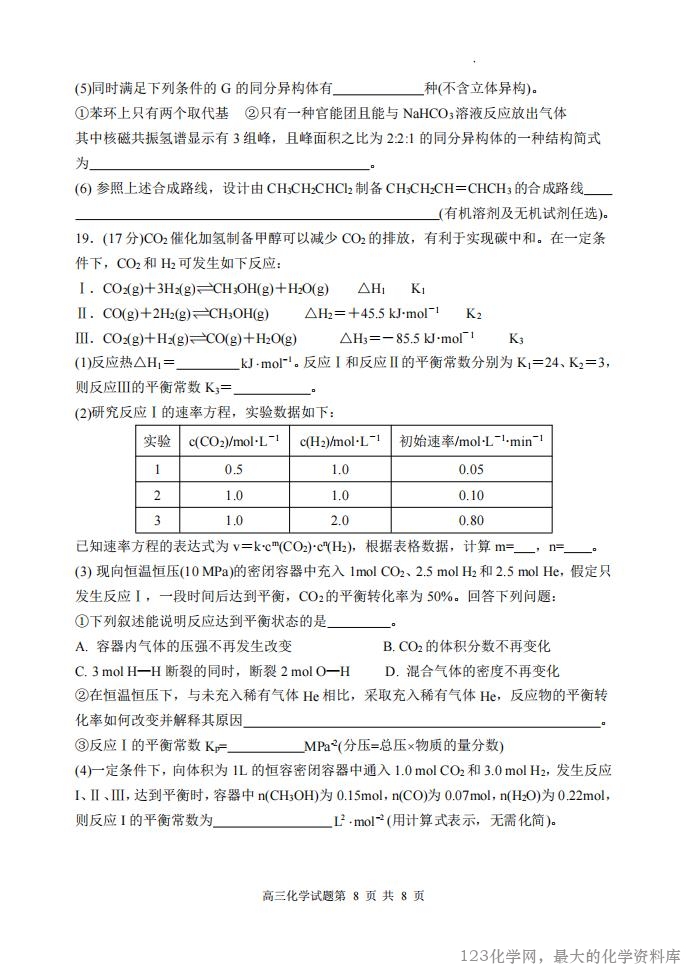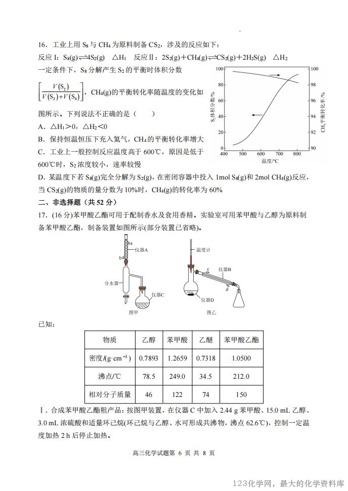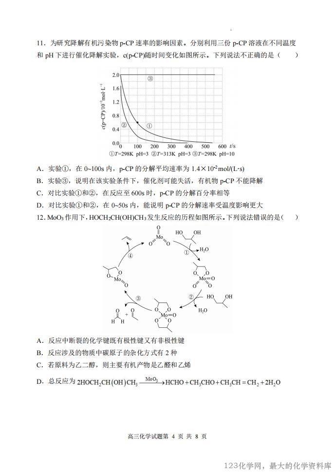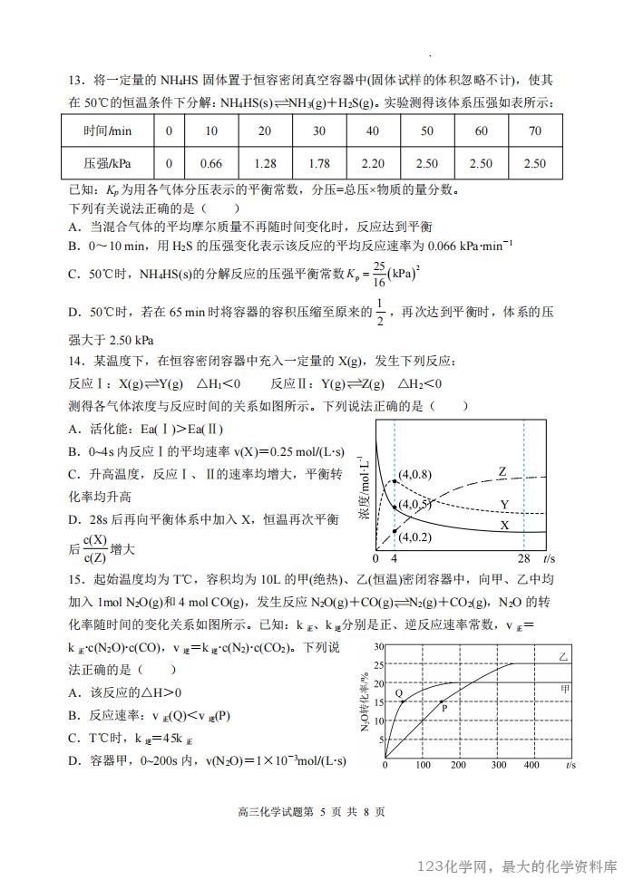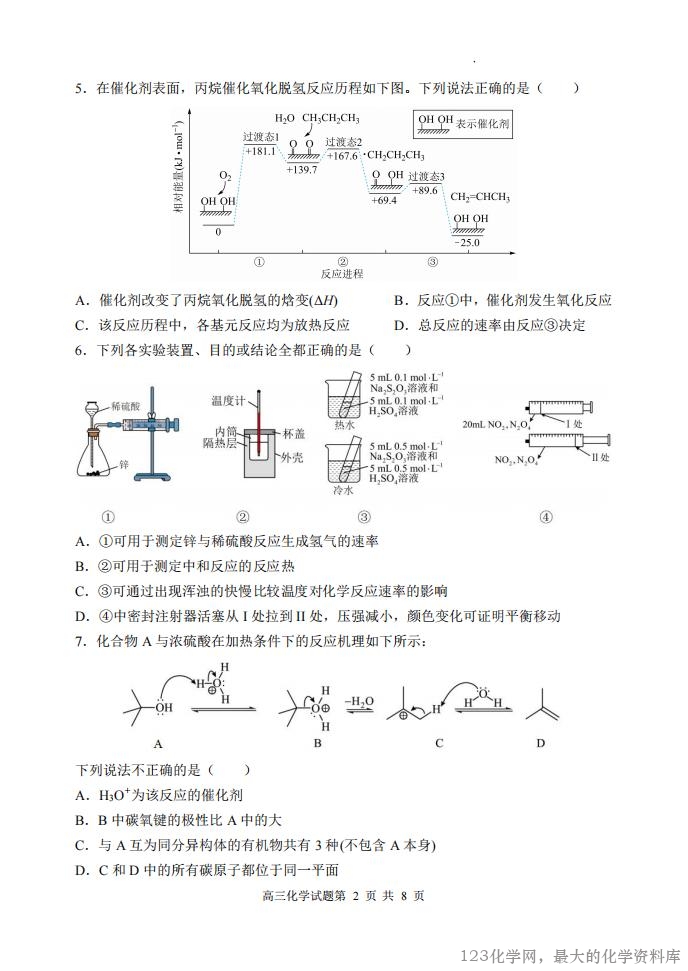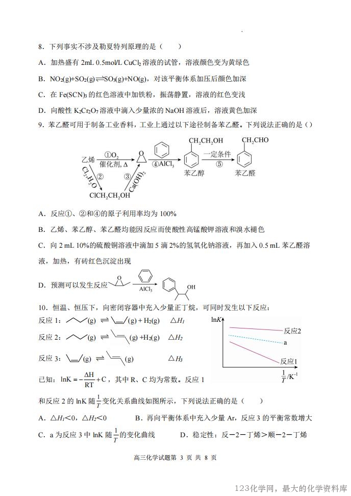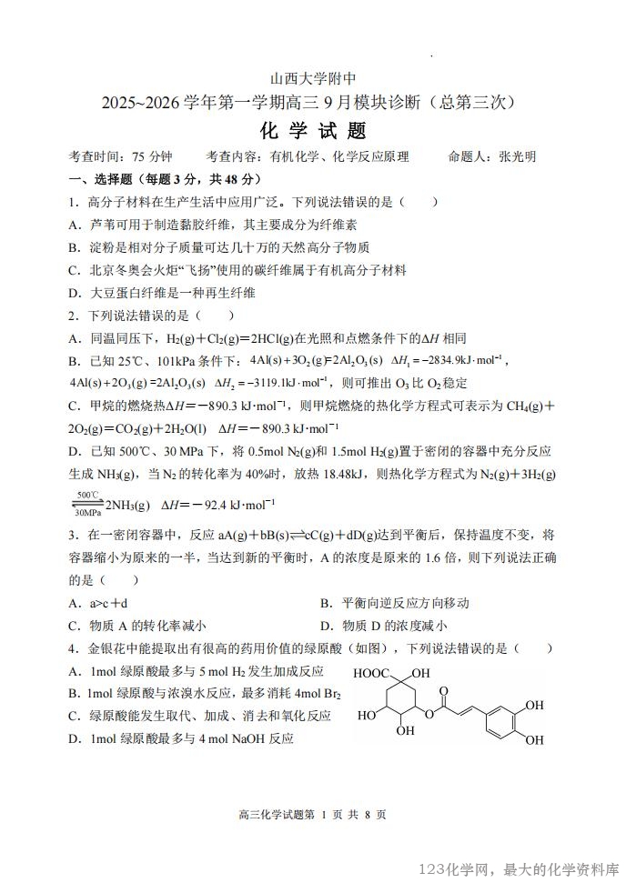 山西大学附中 2025~2026 学年第一学期高三 9 月模块诊断(总第三次) 化 学 试 题 考查时间:75 分钟 考查内容:有机化学、化学反应原理 命题人:张光明 一、选择题(每题 3 分,共 48 分) 1.高分子材料在生产生活中应用广泛。下列说法错误的是( ) A.芦苇可用于制造黏胶纤维,其主要成分为纤维素 B.淀粉是相对分子质量可达几十万的天然高分子物质 C.北京冬奥会火炬“飞扬”使用的碳纤维属于有机高分子材料 D.大豆蛋白纤维是一种再生纤维 2.下列说法错误的是( ) A.同温同压下,H2(g)+Cl2(g)=2HCl(g)在光照和点燃条件下的ΔH 相同 B.已知 25℃、101kPa 条件下:4Al(s) 3O (g) 2Al O (s) 2 = 2 3 H1 2834.9kJ mol1, 4Al(s) 2O (g) 3 =2Al O (s) 2 3 H2 3119.1kJ mol1,则可推出 O3比 O2稳定 C.甲烷的燃烧热ΔH=-890.3 kJ·mol-1,则甲烷燃烧的热化学方程式可表示为 CH4(g)+ 2O2(g)=CO2(g)+2H2O(l) ΔH=-890.3 kJ·mol-1 D.已知 500℃、30 MPa 下,将 0.5mol N2(g)和 1.5mol H2(g)置于密闭的容器中充分反应 生成 NH3(g),当 N2的转化率为 40%时,放热 18.48kJ,则热化学方程式为 N2(g)+3H2(g) 2NH3(g) ΔH=-92.4 kJ·mol-1 3.在一密闭容器中,反应 aA(g)+bB(s) cC(g)+dD(g)达到平衡后,保持温度不变,将 容器缩小为原来的一半,当达到新的平衡时,A 的浓度是原来的 1.6 倍,则下列说法正确 的是( ) A.a>c+d B.平衡向逆反应方向移动 C.物质 A 的转化率减小 D.物质 D 的浓度减小 4.金银花中能提取出有很高的药用价值的绿原酸(如图),下列说法错误的是( ) A.1mol 绿原酸最多与 5 mol H2发生加成反应 B.1mol 绿原酸与浓溴水反应,最多消耗 4mol Br2 C.绿原酸能发生取代、加成、消去和氧化反应 D.1mol 绿原酸最多与 4 mol NaOH 反应