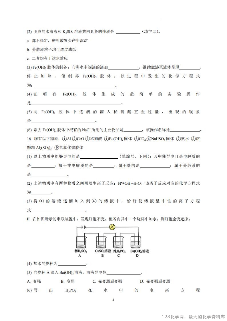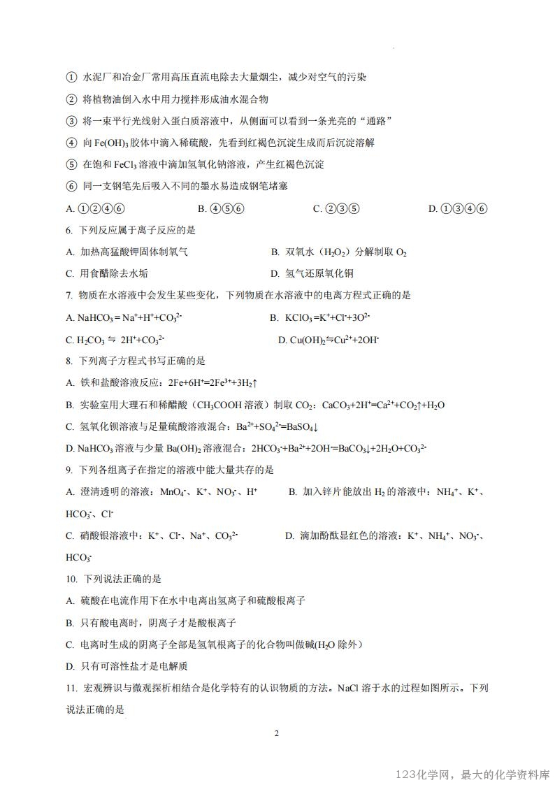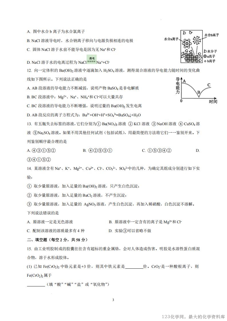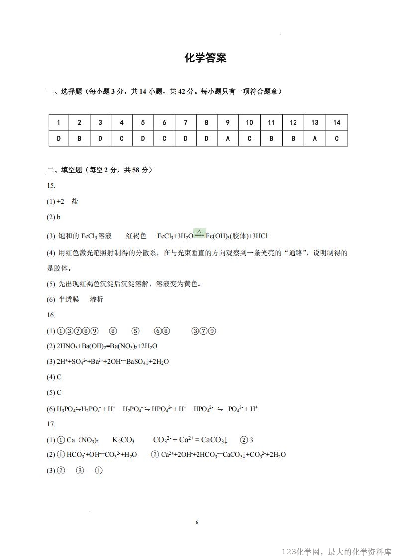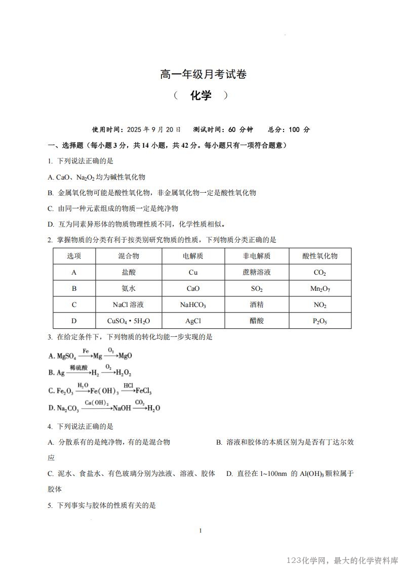 使用时间:2025 年 9 月 20 日 测试时间:60 分钟 总分:100 分 一、选择题(每小题 3 分,共 14 小题,共 42 分。每小题只有一项符合题意) 1. 下列说法正确的是 A. CaO、Na2O2均为碱性氧化物 B. 金属氧化物可能是酸性氧化物,非金属氧化物一定是酸性氧化物 C. 由同一种元素组成的物质一定是纯净物 D. 互为同素异形体的物质物理性质不同,化学性质相似。 2. 掌握物质的分类有利于按类别研究物质的性质,下列物质分类正确的是