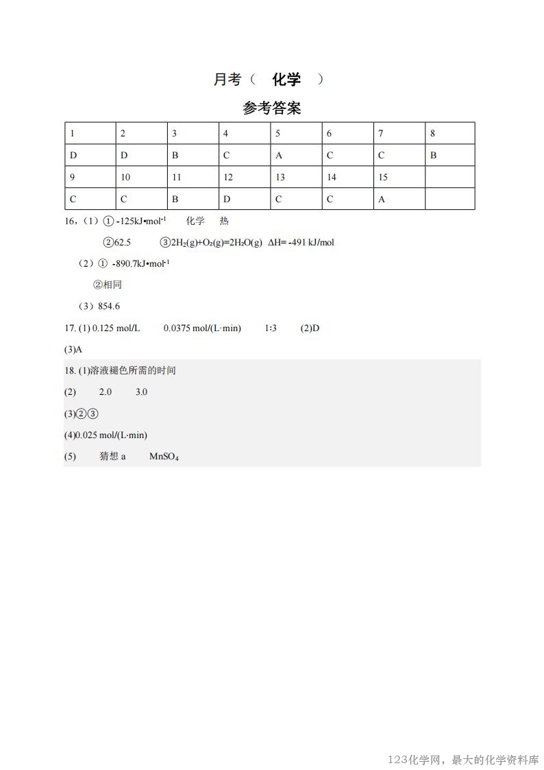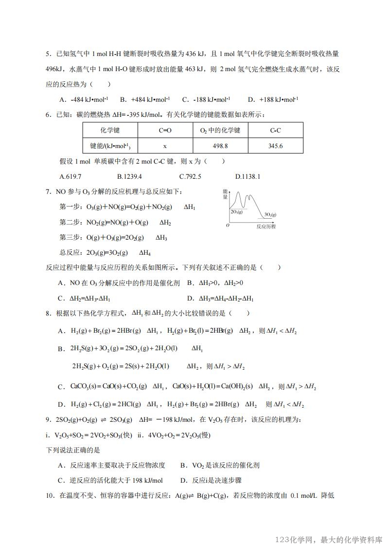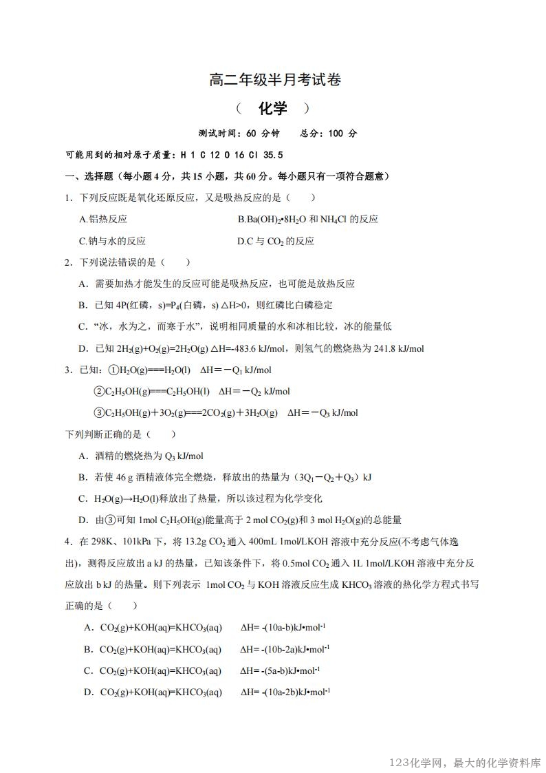 高二年级半月考试卷 ( 化学 ) 测试时间:60 分钟 总分:100 分 可能用到的相对原子质量:H 1 C 12 O 16 Cl 35.5 一、选择题(每小题 4 分,共 15 小题,共 60 分。每小题只有一项符合题意) 1.下列反应既是氧化还原反应,又是吸热反应的是( ) A.铝热反应 B.Ba(OH)2•8H2O 和 NH4Cl 的反应 C.钠与水的反应 D.C 与 CO2的反应 2.下列说法错误的是( ) A.需要加热才能发生的反应可能是吸热反应,也可能是放热反应 B.已知 4P(红磷,s)=P4(白磷,s) △H>0,则红磷比白磷稳定 C.“冰,水为之,而寒于水”,说明相同质量的水和冰相比较,冰的能量低 D.已知 2H2(g)+O2(g)=2H2O(g) △H=-483.6 kJ/mol,则氢气的燃烧热为 241.8 kJ/mol 3.已知:①H2O(g)===H2O(l) ΔH=-Q1 kJ/mol ②C2H5OH(g)===C2H5OH(l) ΔH=-Q2 kJ/mol ③C2H5OH(g)+3O2(g)===2CO2(g)+3H2O(g) ΔH=-Q3 kJ/mol 下列判断正确的是( ) A.酒精的燃烧热为 Q3 kJ/mol B.若使 46 g 酒精液体完全燃烧,释放出的热量为(3Q1-Q2+Q3)kJ C.H2O(g)→H2O(l)释放出了热量,所以该过程为化学变化 D.由③可知 1mol C2H5OH(g)能量高于 2 mol CO2(g)和 3 mol H2O(g)的总能量 4.在 298K、101kPa 下,将 13.2g CO2通入 400mL 1mol/LKOH 溶液中充分反应(不考虑气体逸 出),测得反应放出 a kJ 的热量,已知该条件下,将 0.5mol CO2通入 1L 1mol/LKOH 溶液中充分反 应放出 b kJ 的热量。则下列表示 1mol CO2与 KOH 溶液反应生成 KHCO3溶液的热化学方程式书写 正确的是( ) A.CO2(g)+KOH(aq)=KHCO3(aq) ΔH= -(10a-b)kJ•mol-1 B.CO2(g)+KOH(aq)=KHCO3(aq) ΔH= -(10b-2a)kJ•mol-1 C.CO2(g)+KOH(aq)=KHCO3(aq) ΔH= -(5a-b)kJ•mol-1 D.CO2(g)+KOH(aq)=KHCO3(aq) ΔH= -(10a-2b)kJ•mol-15.已知氢气中 1 mol H-H 键断裂时吸收热量为 436 kJ,且 1 mol 氧气中化学键完全断裂时吸收热量 496kJ,水蒸气中 1 mol H-O 键形成时放出能量 463 kJ,则 2 mol 氢气完全燃烧生成水蒸气