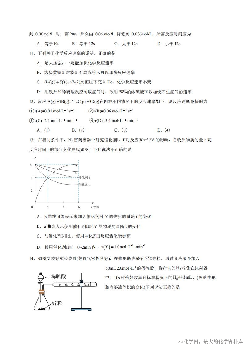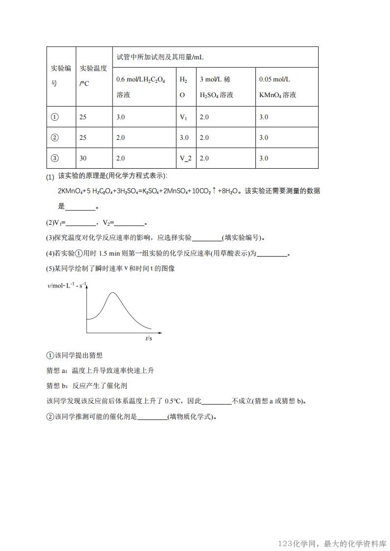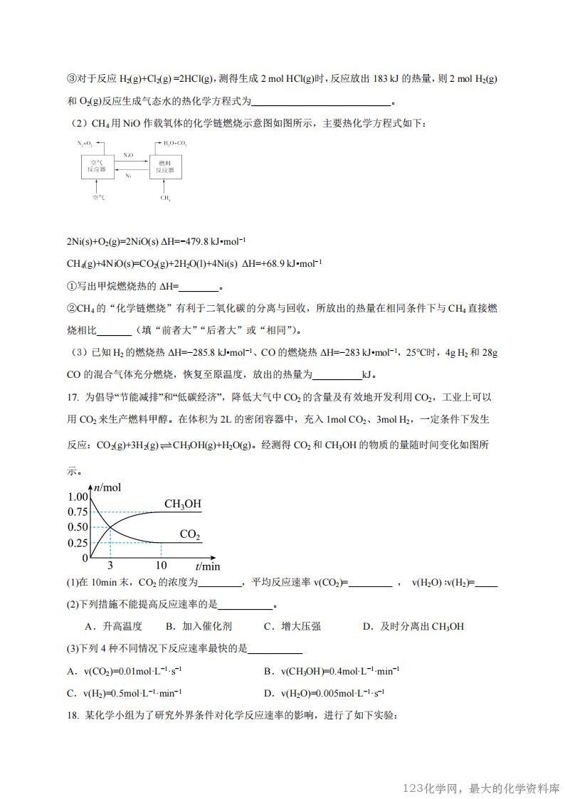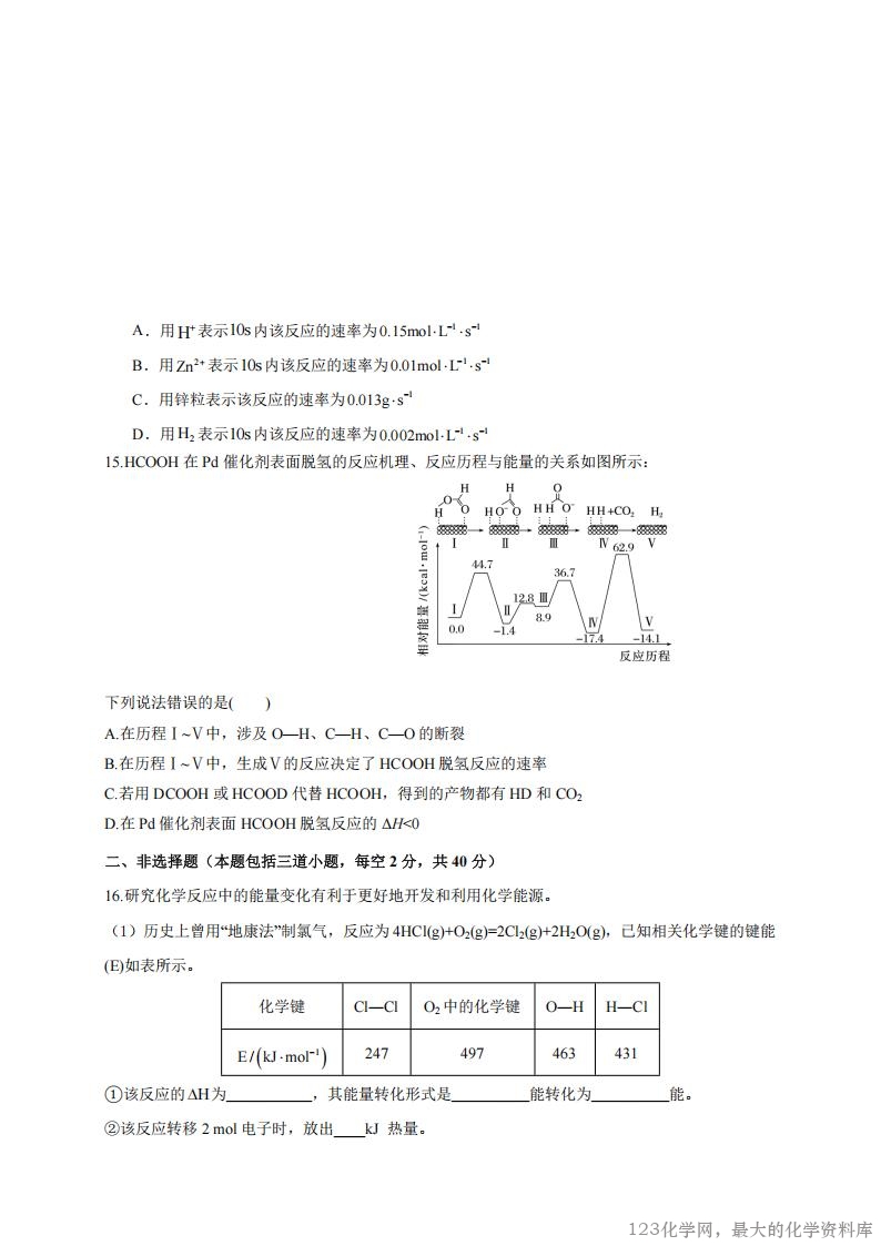 高二年级半月考试卷 ( 化学 ) 测试时间:60 分钟 总分:100 分 可能用到的相对原子质量:H 1 C 12 O 16 Cl 35.5 一、选择题(每小题 4 分,共 15 小题,共 60 分。每小题只有一项符合题意) 1.下列反应既是氧化还原反应,又是吸热反应的是( ) A.铝热反应 B.Ba(OH)2•8H2O 和 NH4Cl 的反应 C.钠与水的反应 D.C 与 CO2的反应 2.下列说法错误的是( ) A.需要加热才能发生的反应可能是吸热反应,也可能是放热反应 B.已知 4P(红磷,s)=P4(白磷,s) △H>0,则红磷比白磷稳定 C.“冰,水为之,而寒于水”,说明相同质量的水和冰相比较,冰的能量低 D.已知 2H2(g)+O2(g)=2H2O(g) △H=-483.6 kJ/mol,则氢气的燃烧热为 241.8 kJ/mol 3.已知:①H2O(g)===H2O(l) ΔH=-Q1 kJ/mol ②C2H5OH(g)===C2H5OH(l) ΔH=-Q2 kJ/mol ③C2H5OH(g)+3O2(g)===2CO2(g)+3H2O(g) ΔH=-Q3 kJ/mol 下列判断正确的是( ) A.酒精的燃烧热为 Q3 kJ/mol B.若使 46 g 酒精液体完全燃烧,释放出的热量为(3Q1-Q2+Q3)kJ C.H2O(g)→H2O(l)释放出了热量,所以该过程为化学变化 D.由③可知 1mol C2H5OH(g)能量高于 2 mol CO2(g)和 3 mol H2O(g)的总能量 4.在 298K、101kPa 下,将 13.2g CO2通入 400mL 1mol/LKOH 溶液中充分反应(不考虑气体逸 出),测得反应放出 a kJ 的热量,已知该条件下,将 0.5mol CO2通入 1L 1mol/LKOH 溶液中充分反 应放出 b kJ 的热量。则下列表示 1mol CO2与 KOH 溶液反应生成 KHCO3溶液的热化学方程式书写 正确的是( ) A.CO2(g)+KOH(aq)=KHCO3(aq) ΔH= -(10a-b)kJ•mol-1 B.CO2(g)+KOH(aq)=KHCO3(aq) ΔH= -(10b-2a)kJ•mol-1 C.CO2(g)+KOH(aq)=KHCO3(aq) ΔH= -(5a-b)kJ•mol-1 D.CO2(g)+KOH(aq)=KHCO3(aq) ΔH= -(10a-2b)kJ•mol-15.已知氢气中 1 mol H-H 键断裂时吸收热量为 436 kJ,且 1 mol 氧气中化学键完全断裂时吸收热量 496kJ,水蒸气中 1 mol H-O 键形成时放出能量 463 kJ,则 2 mol 氢气完全燃烧生成水蒸气