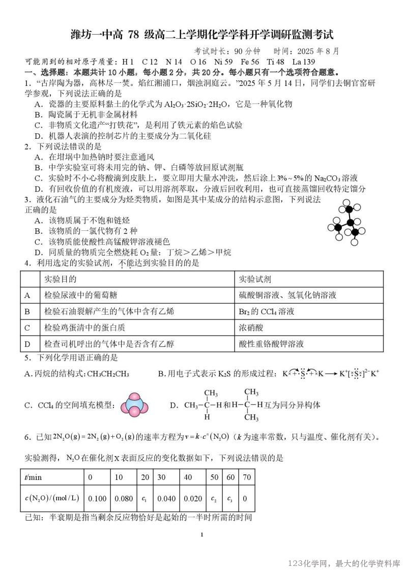 潍坊- -中高78级高二上学期化学学科开学调研监测考试