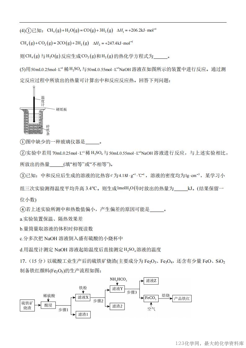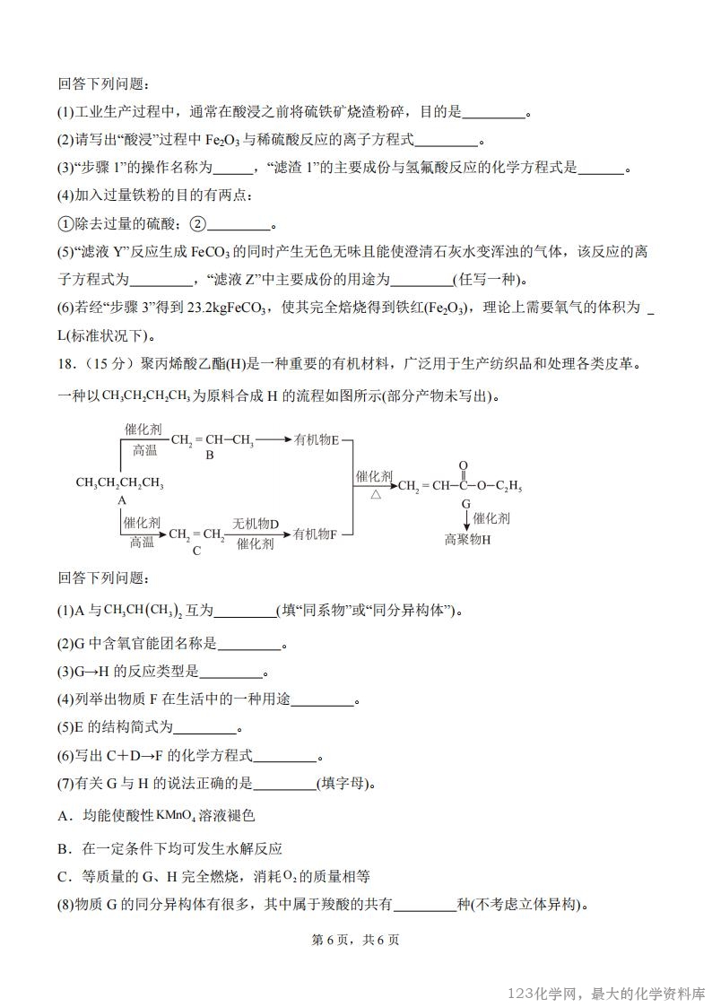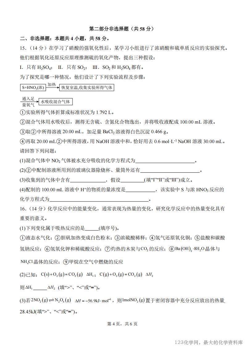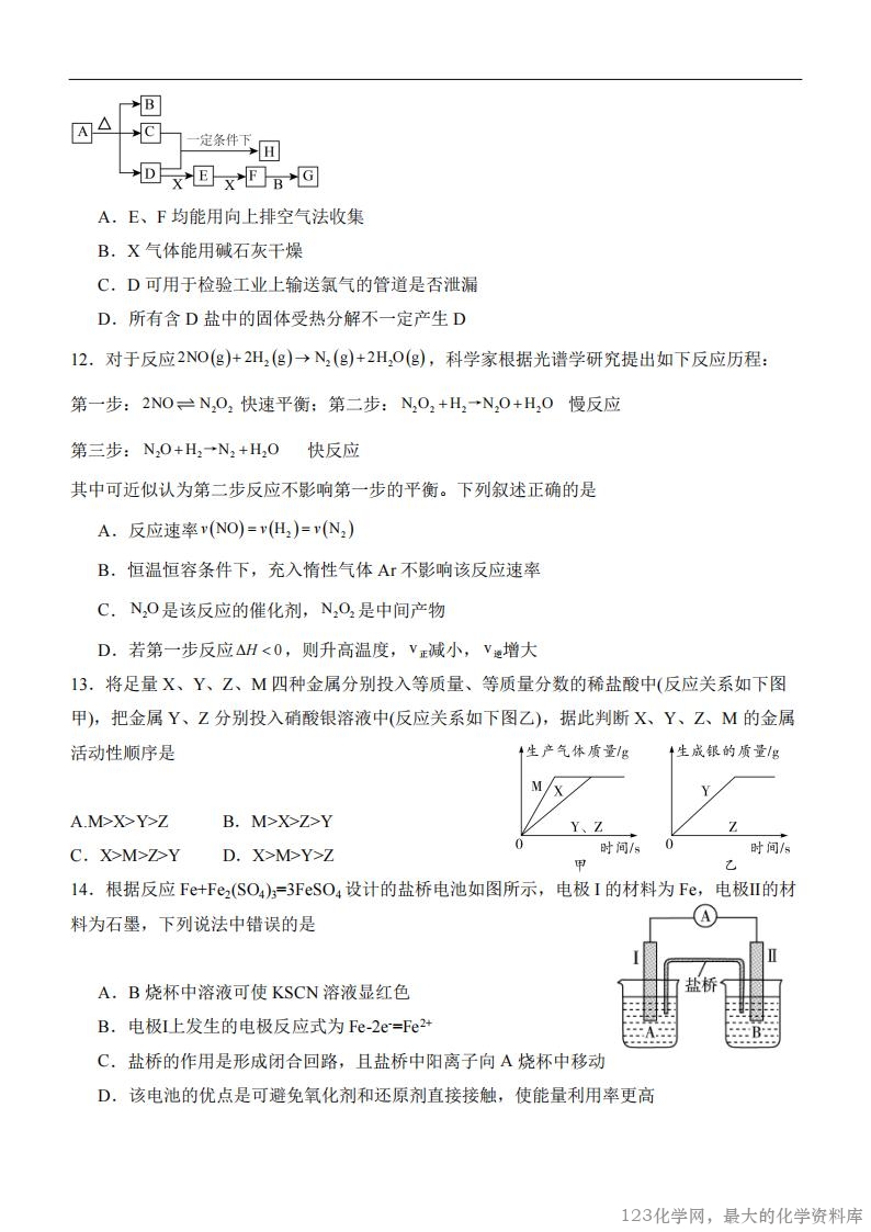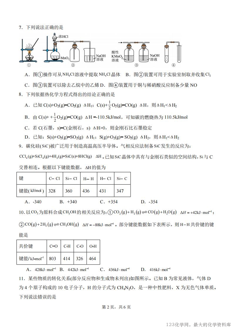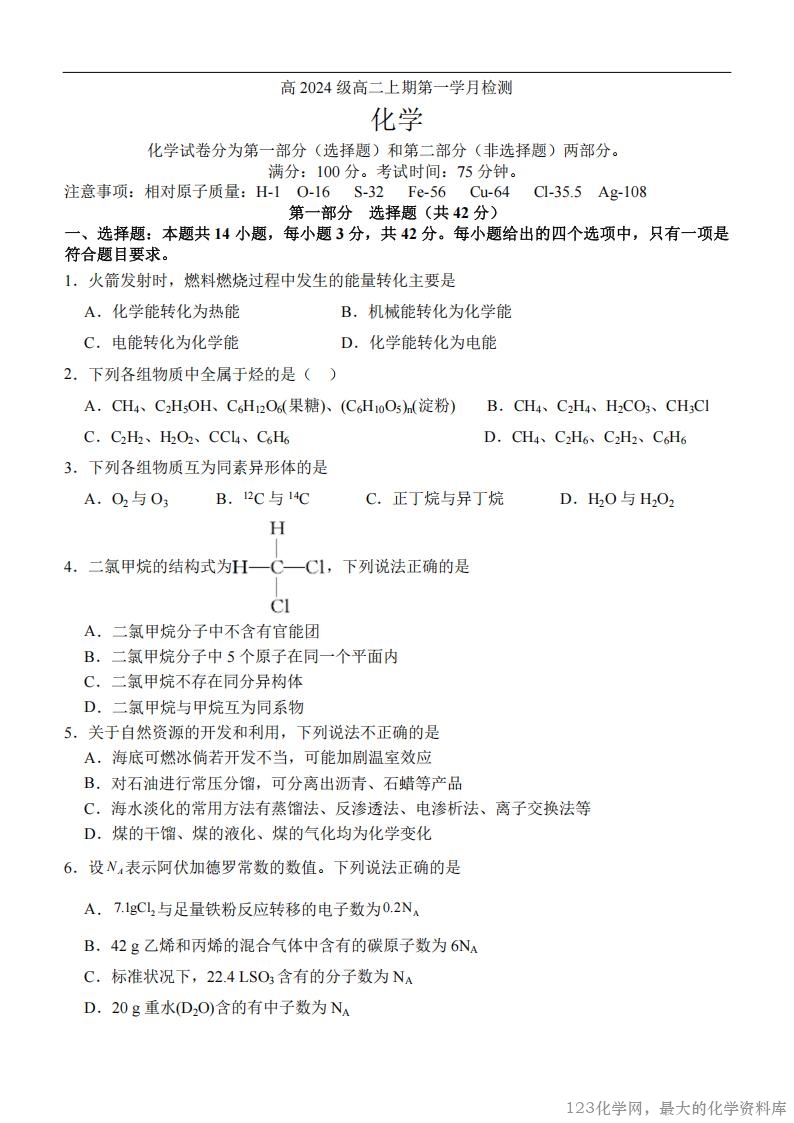 高 2024 级高二上期第一学月检测 化学 化学试卷分为第一部分(选择题)和第二部分(非选择题)两部分。 满分:100 分。考试时间:75 分钟。 注意事项:相对原子质量:H-1 O-16 S-32 Fe-56 Cu-64 Cl-35.5 Ag-108 第一部分 选择题(共 42 分) 一、选择题:本题共 14 小题,每小题 3 分,共 42 分。每小题给出的四个选项中,只有一项是 符合题目要求。 1.火箭发射时,燃料燃烧过程中发生的能量转化主要是 A.化学能转化为热能 B.机械能转化为化学能 C.电能转化为化学能 D.化学能转化为电能 2.下列各组物质中全属于烃的是( ) A.CH4、C2H5OH、C6H12O6(果糖)、(C6H10O5)n(淀粉) B.CH4、C2H4、H2CO3、CH3Cl C.C2H2、H2O2、CCl4、C6H6 D.CH4、C2H6、C2H2、C6H6 3.下列各组物质互为同素异形体的是 A.O2与 O3 B.12C 与 14C C.正丁烷与异丁烷 D.H2O 与 H2O2 4.二氯甲烷的结构式为 ,下列说法正确的是 A.二氯甲烷分子中不含有官能团 B.二氯甲烷分子中 5 个原子在同一个平面内 C.二氯甲烷不存在同分异构体 D.二氯甲烷与甲烷互为同系物 5.关于自然资源的开发和利用,下列说法不正确的是 A.海底可燃冰倘若开发不当,可能加剧温室效应 B.对石油进行常压分馏,可分离出沥青、石蜡等产品 C.海水淡化的常用方法有蒸馏法、反渗透法、电渗析法、离子交换法等 D.煤的干馏、煤的液化、煤的气化均为化学变化 6.设 NA表示阿伏加德罗常数的数值。下列说法正确的是 A.7.1gCl2与足量铁粉反应转移的电子数为0.2NA B.42 g 乙烯和丙烯的混合气体中含有的碳原子数为 6NA C.标准状况下,22.4 LSO3含有的分子数为