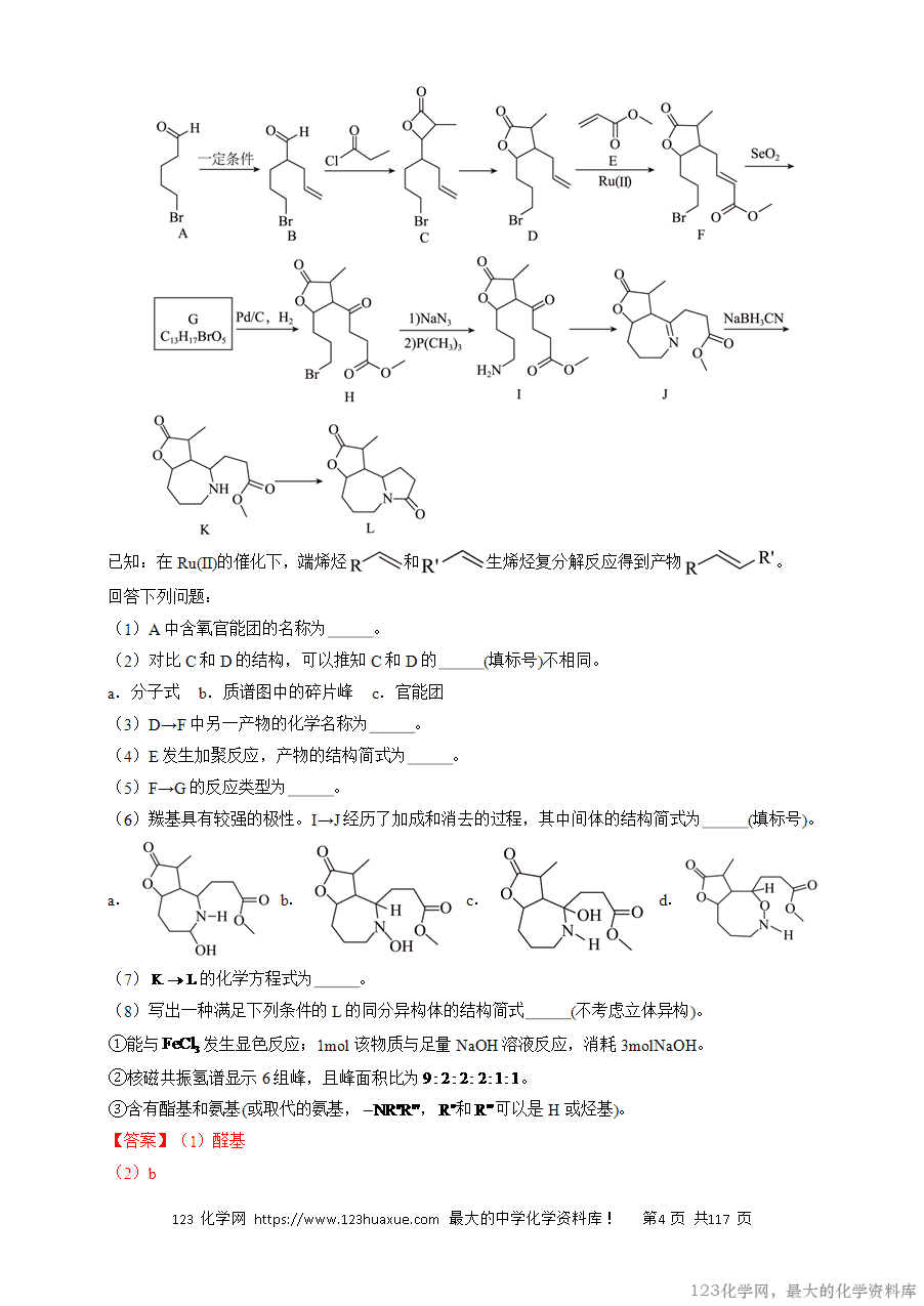 近几年的高考题对于有机化学基础综合题的考查,命题思路相对稳定,试题难度基本不变。题目覆盖有机物主干基础知识,侧重考查新信息获取、新旧知识的整合应用能力,考查学生有序思维和整合新旧知识解决有机问题的能力。从背景上来看,密切联系生产生活实际。核心物质的选取以及题干的设计以材料科学、药物化学等具体应用为情境,渗透有机化学的重大贡献,我国科学家的最新研究成果等,将高中阶段的有机反应和新反应结合起来,新反应通过信息给出,将基础和创新融入试题,设问由浅入深,既考查了学生对教材中有机化学基础知识的掌握,又考查了学生有机化学知识的综合应用能力。题干设计趋于稳定,仍然采取“流程+新信息给予”的模式。流程中的物质以分子式、结构简式、字母、名称等四种形式呈现。流程中的一些反应,如果是学生未知的,会以新信息的形式单独呈现,或者在流程中以反应条件的形式给予。需要学生现场学习新信息,并进行灵活运用。设问角度及分值,相对固定。设问形式由浅入深,层层推进的且考点稳定。核心物质、反应基本类型、典型条件等设计成基本问题。题日具有一定的梯度,由易到难,最后两问多考查同分异构体的书写、合成路线的设计。这两年的高考题中,一些高考卷中没有涉及合成路线的设计问题,一定程度上降低了整道试题的难度。