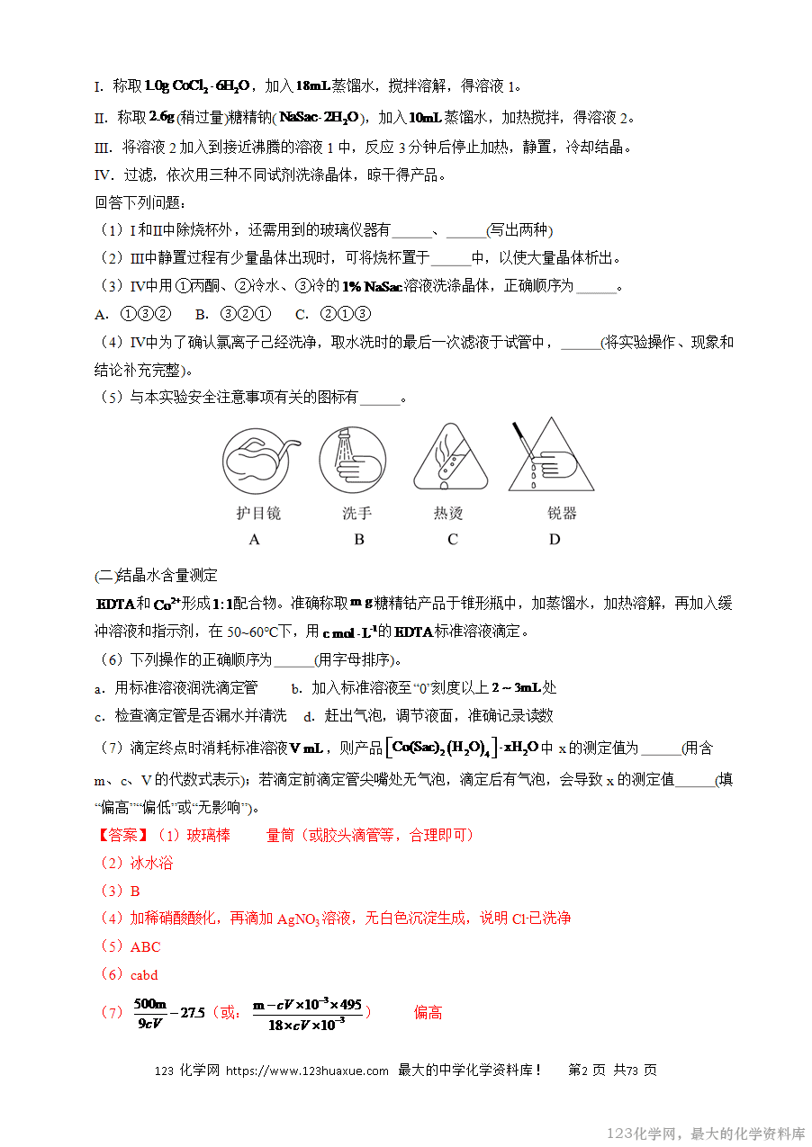 【分析】按照反应制备糖精钴,然后在冰水浴中结晶,再按照“冷的1% NaSac溶液、冷水、丙酮”顺序进行洗涤,得到糖精钴晶体,最后将糖精钴晶体溶解后用EDTA标准溶液滴定测定含有结晶水的数量。