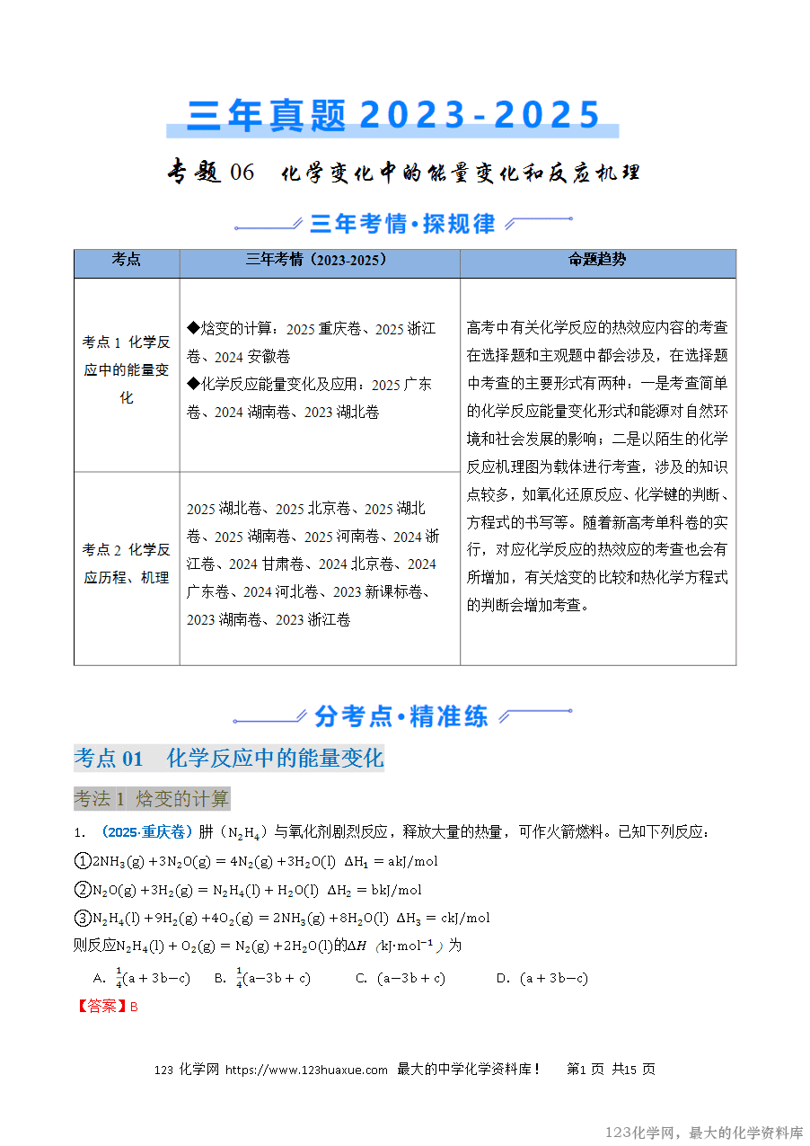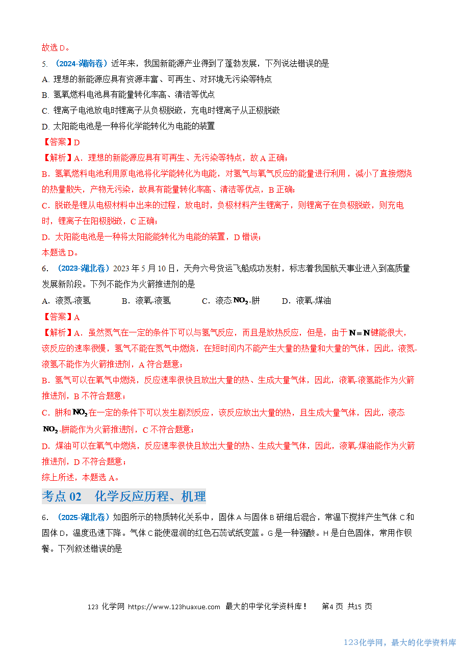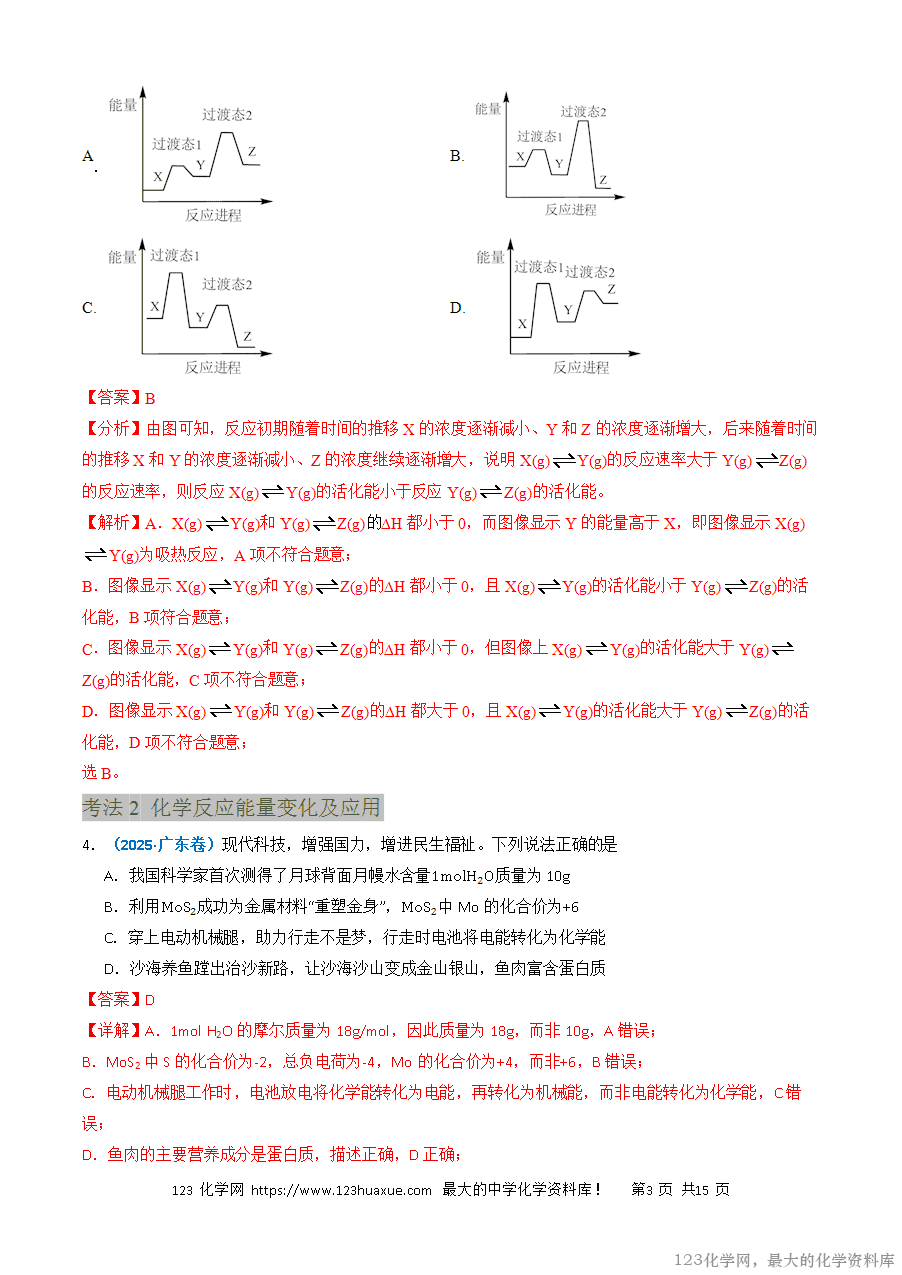 高考中有关化学反应的热效应内容的考查在选择题和主观题中都会涉及,在选择题中考查的主要形式有两种:一是考查简单的化学反应能量变化形式和能源对自然环境和社会发展的影响;二是以陌生的化学反应机理图为载体进行考查,涉及的知识点较多,如氧化还原反应、化学键的判断、方程式的书写等。随着新高考单科卷的实行,对应化学反应的热效应的考查也会有所增加,有关焓变的比较和热化学方程式的判断会增加考查。