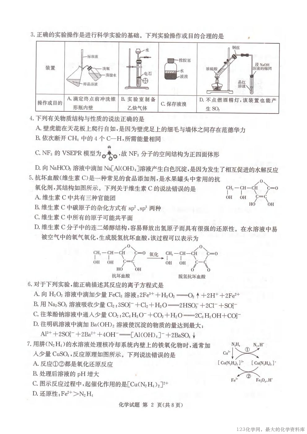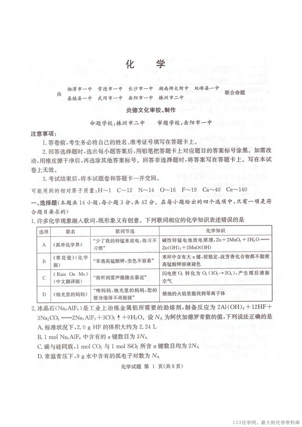 湖南省2026届高三九校联盟2025年9月第一次联考化学试卷含答案